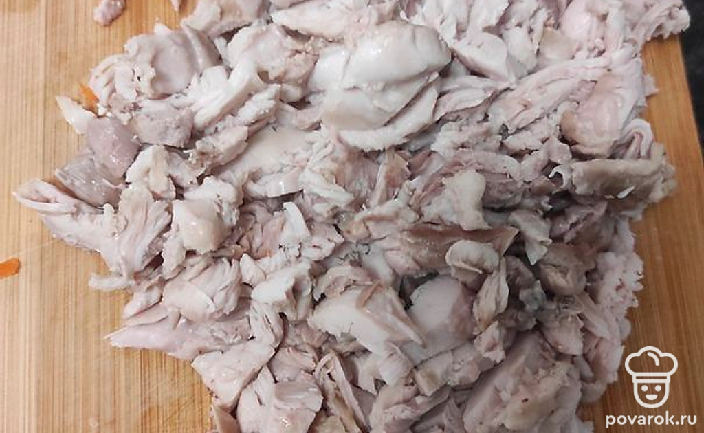 Готовое мясо курицы вытащить из бульона, измельчить.