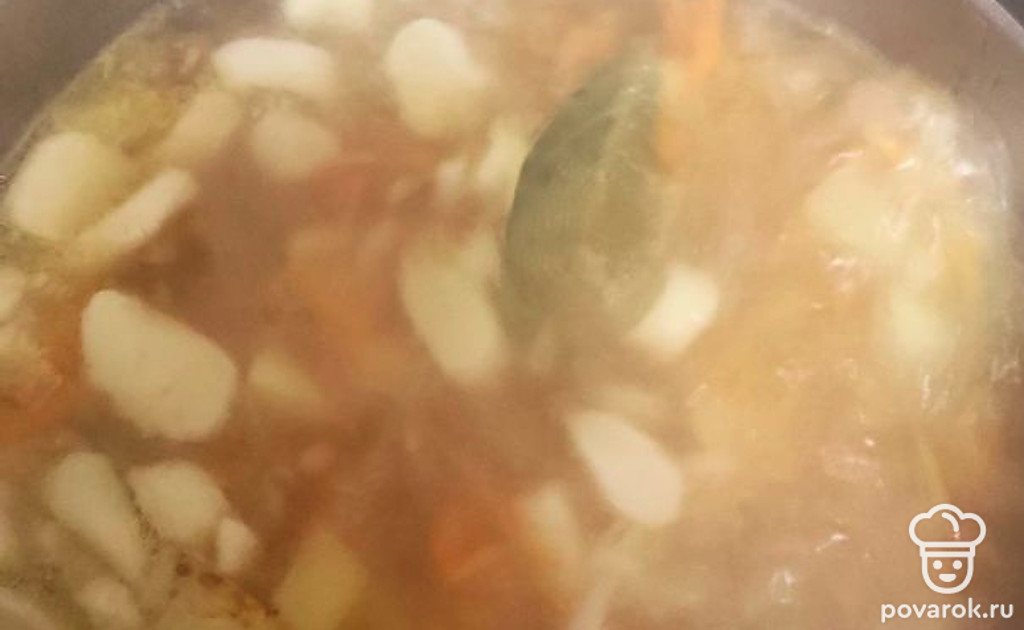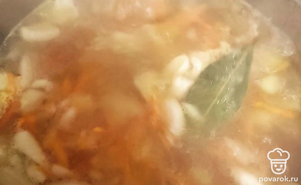 В бульон добавить зажарку, картошку, галушки. Можно положить лавровый лист. Варить 10-15 минут.