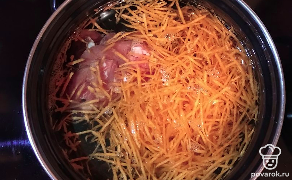 Филе свинины порезать на мелкие кусочки. Морковь натереть на терке. Отправить вариться минут на 20.