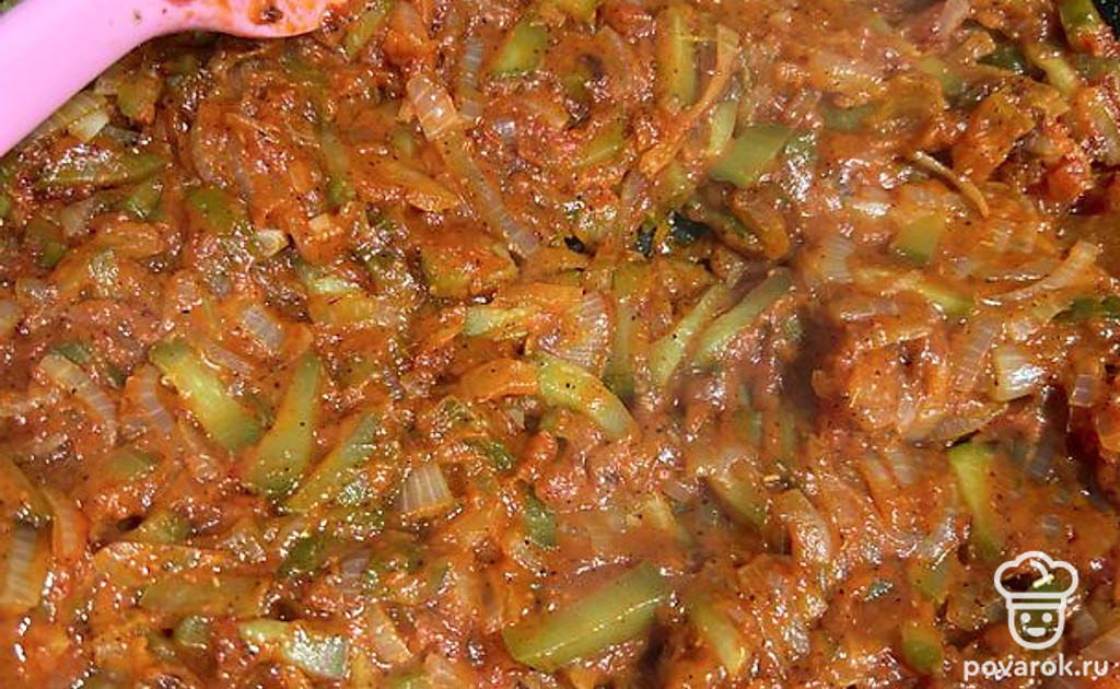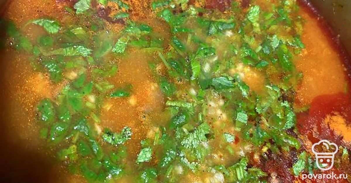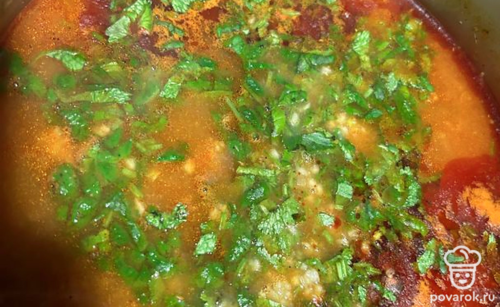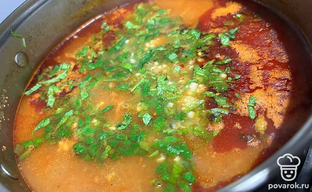 Когда мясо сварится, выкладываем в бульон зажарку.