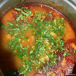 Брусочками нарезаем говядину и отвариваем в подсоленной воде. Мелко нарезаем лук и огурцы, обжариваем на растительном масле, добавляем томатную пасту и специи по вкусу.