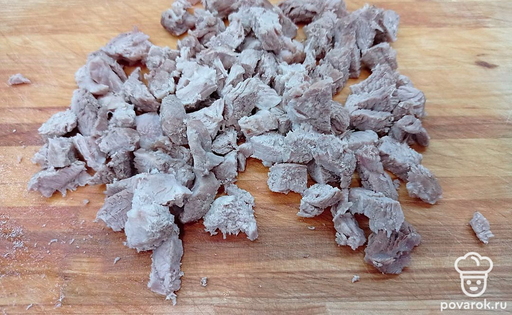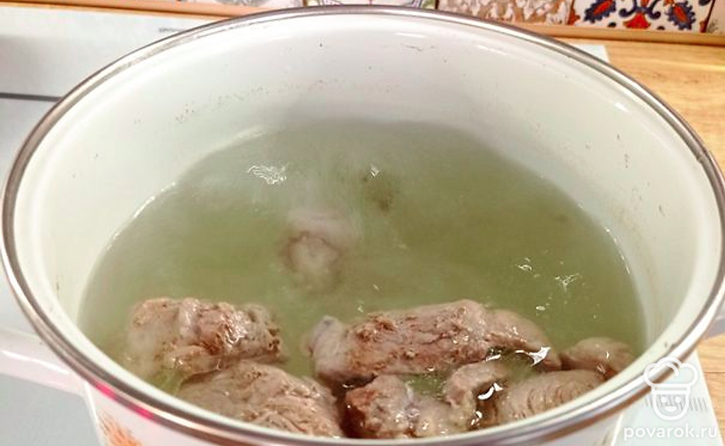 Отварить свинину до готовности, периодически убирая из бульона накипь.