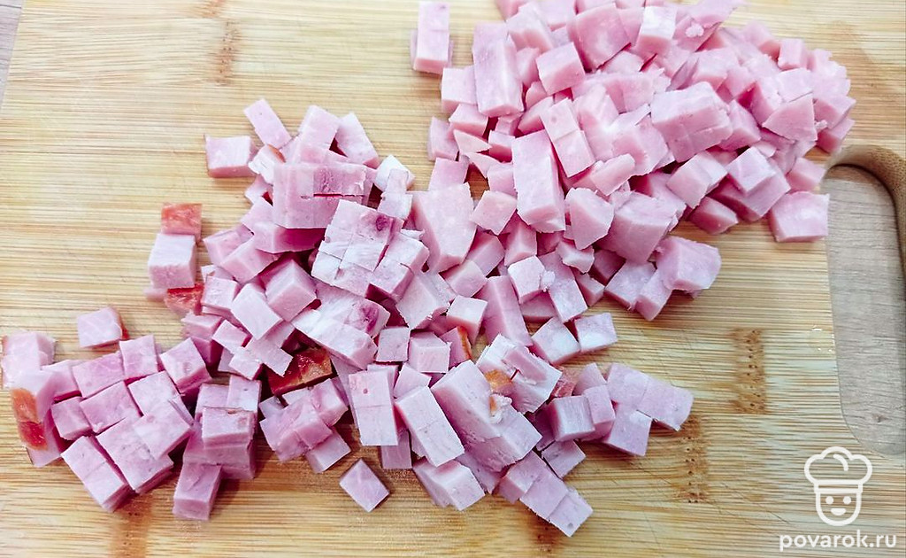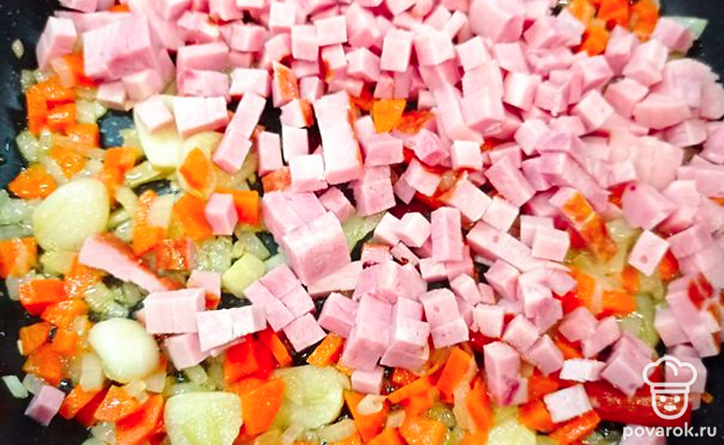 Добавить на сковороду нарезанные кубиками лук и морковь, обжарить, добавить ветчину и карбонад.