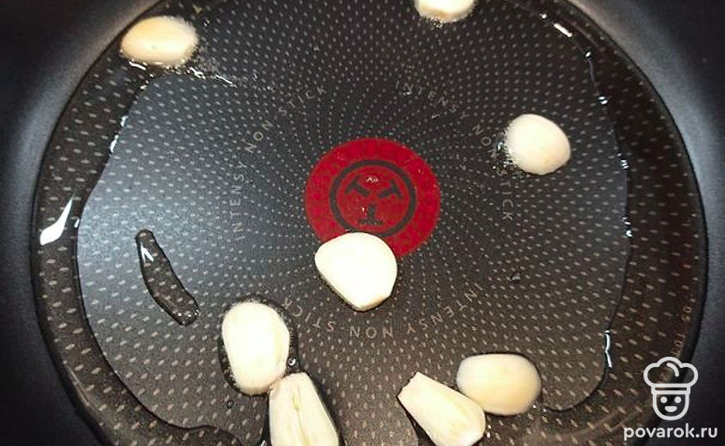Обжарить чеснок на сковороде в двух ложках растительного масла, чтобы он отдал свой аромат.