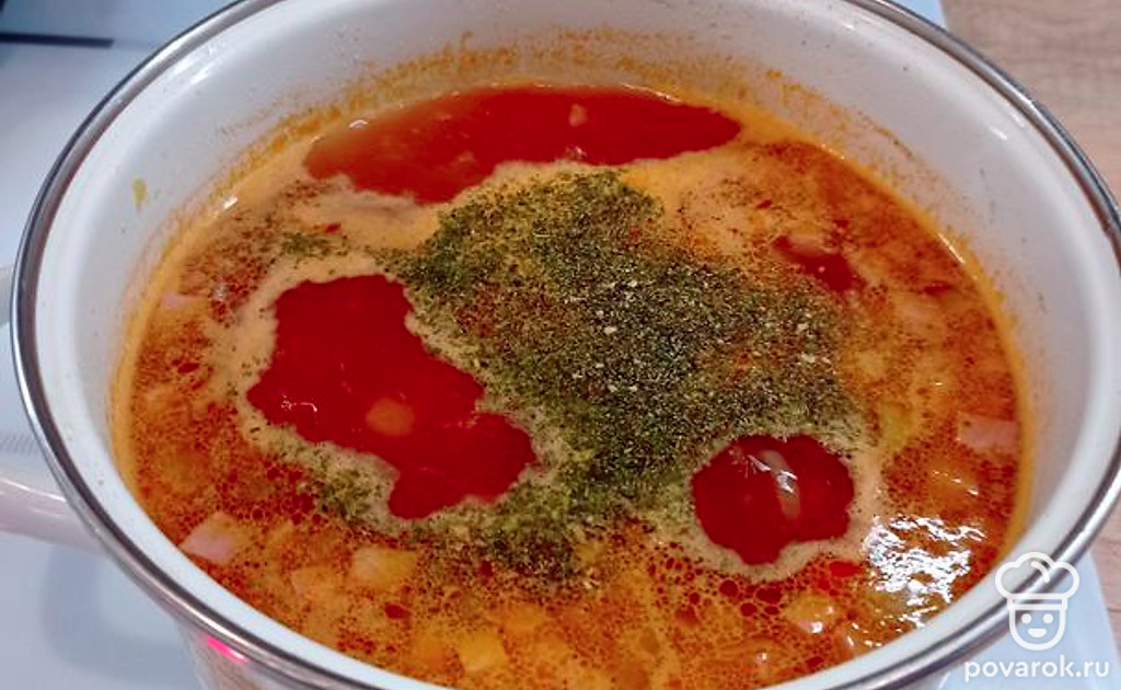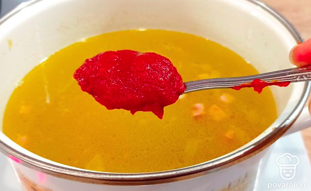 Переложить поджарку в готовый бульон, добавить порезанный кубиками картофель и три чайные ложки томатной пасты.