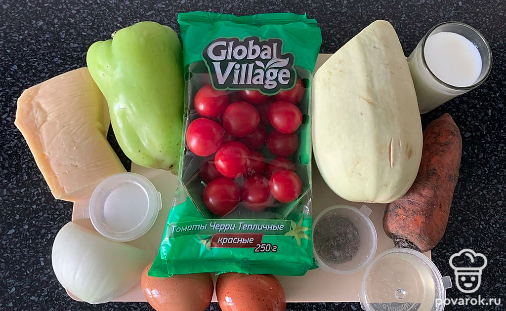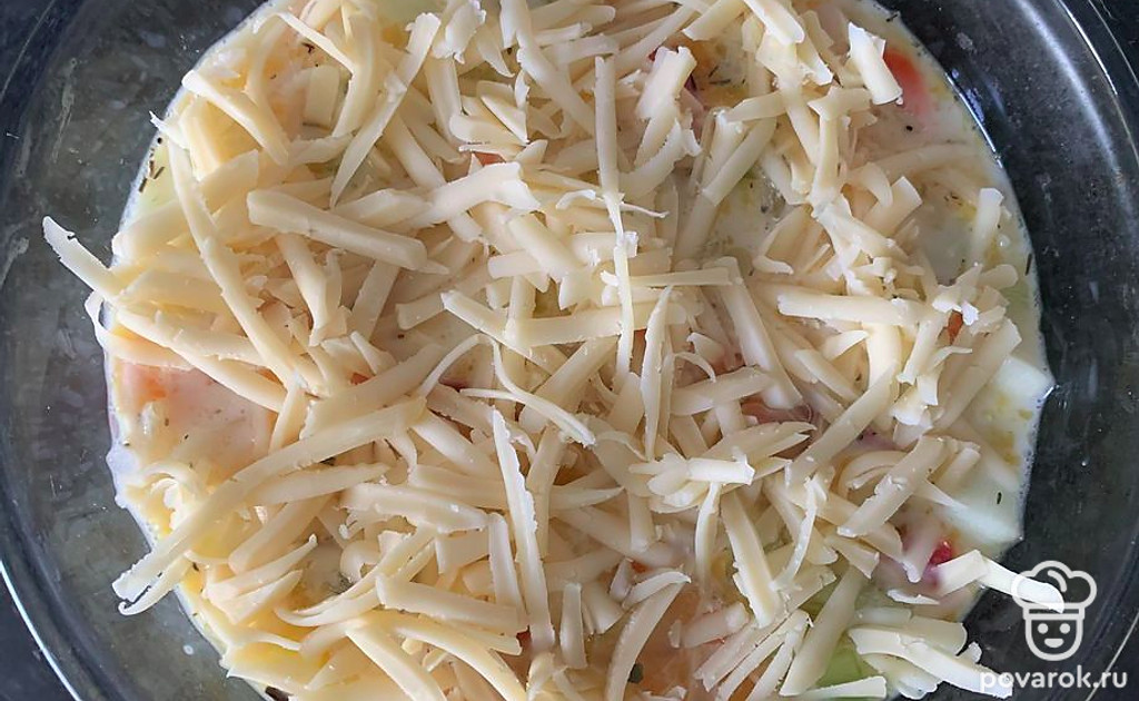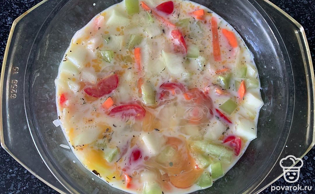 Залейте овощи яично-молочной смесью.