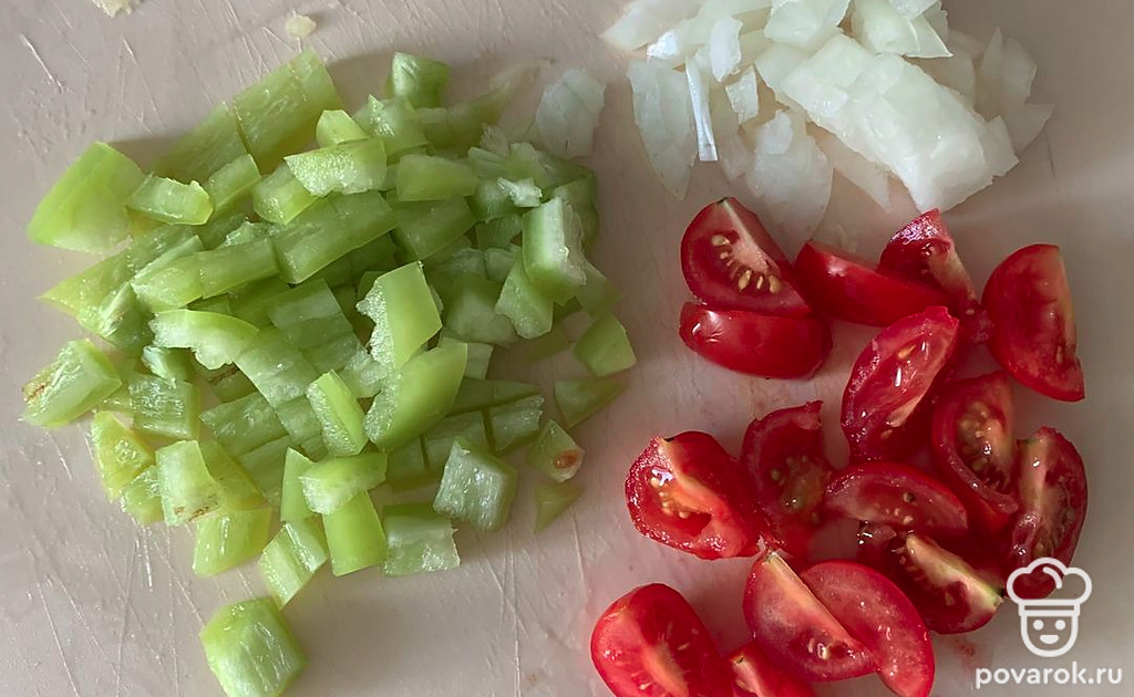 Нашинкуйте помидоры, перец и лук.