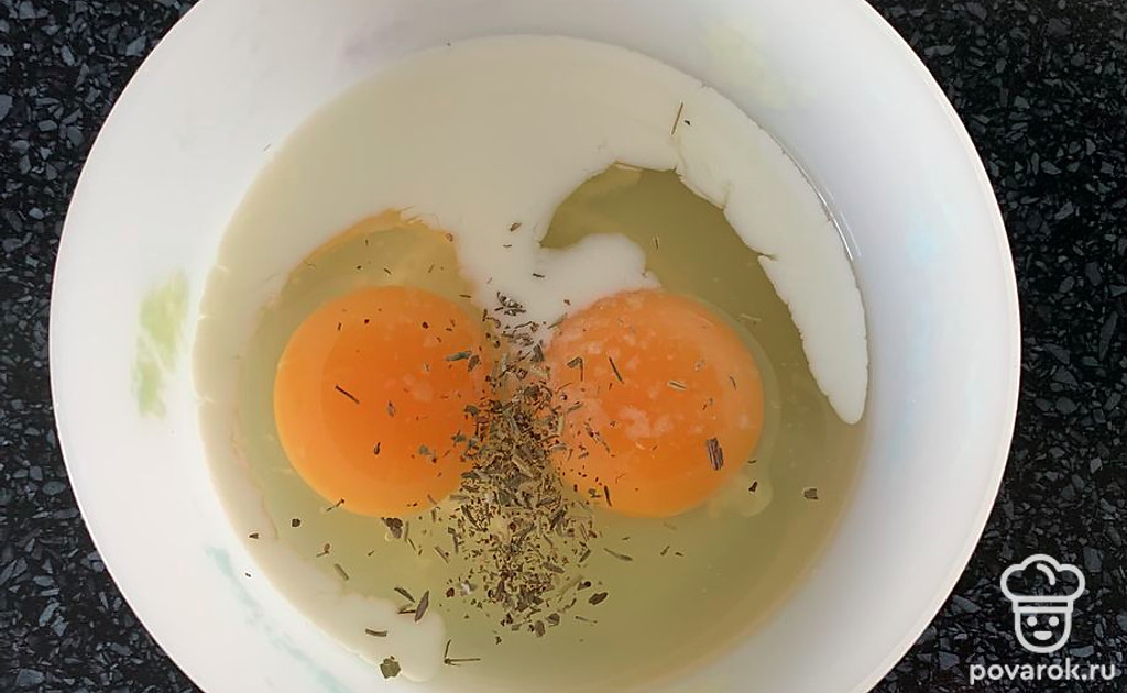 Яйца смешайте с молоком. Добавьте соль и специи. Перемешайте.