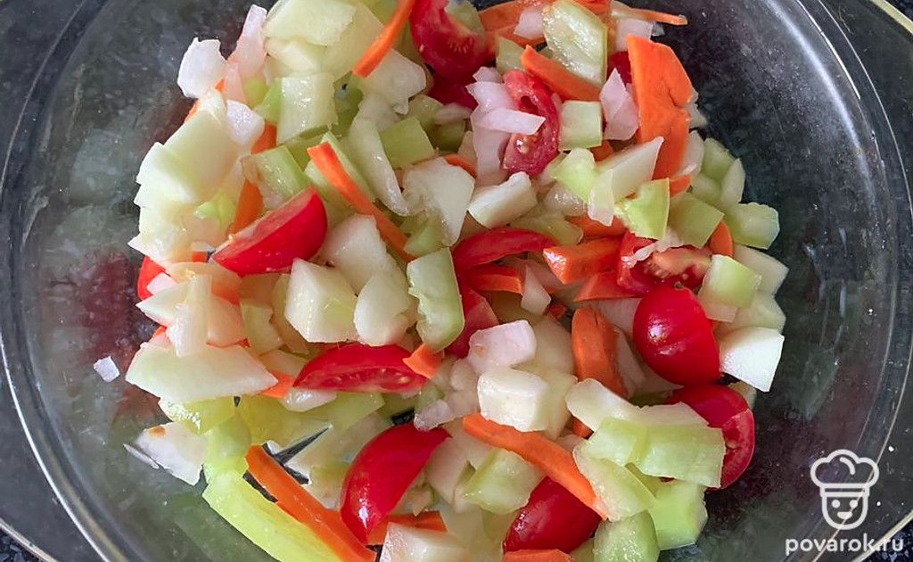 Нарезанные овощи выложите в смазанную форму для запекания.