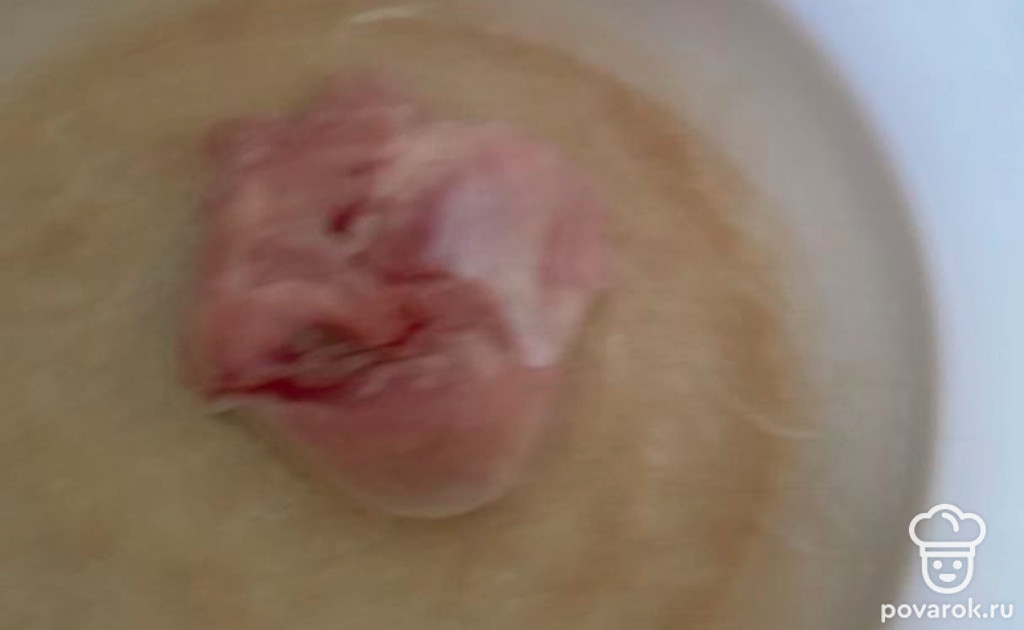 Куриное бедро заливаем 1 литром воды и отправляем вариться. Варим на сильном огне до закипания, затем убавляем огонь.