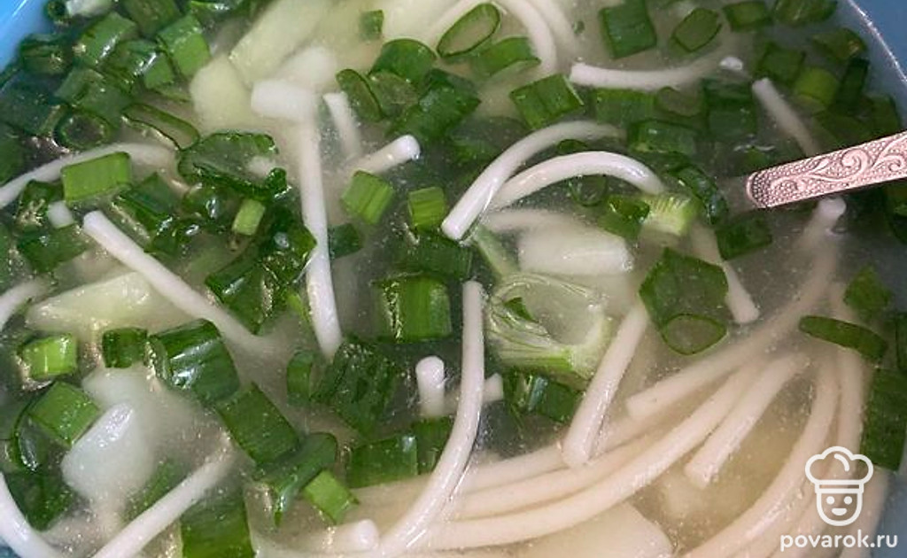 Когда картофель и куриное бедро полностью сварились добавляем спагетти, включаем максимальный огонь, варим 2 минуты, выключаем огонь, закрываем крышкой и оставляем настояться 10 минут.