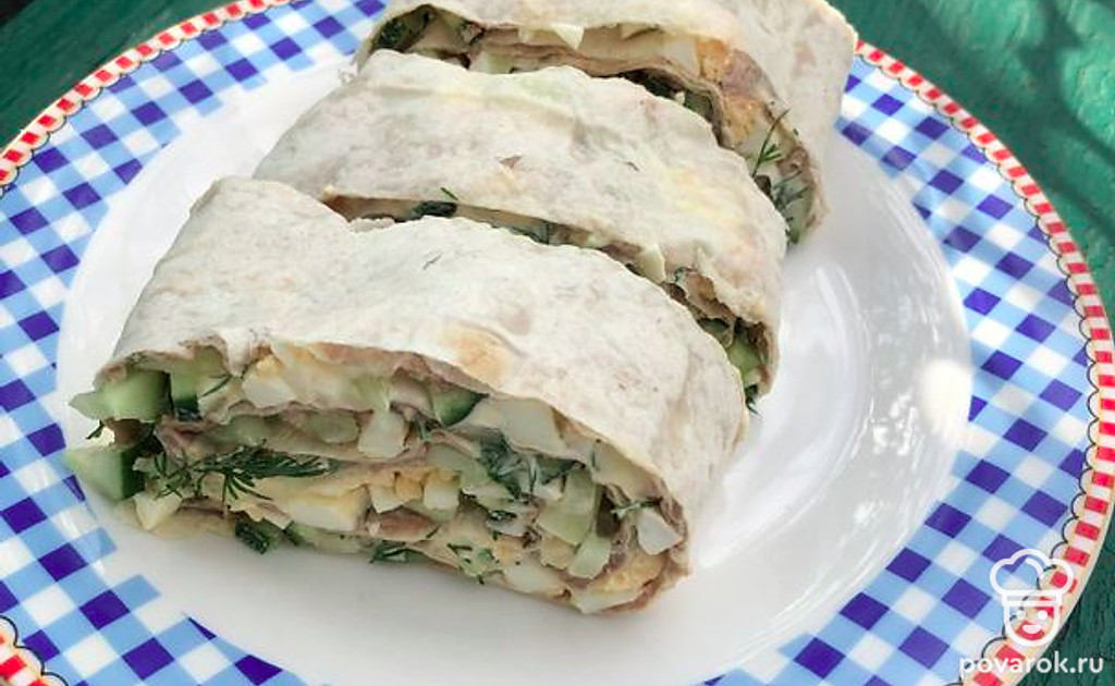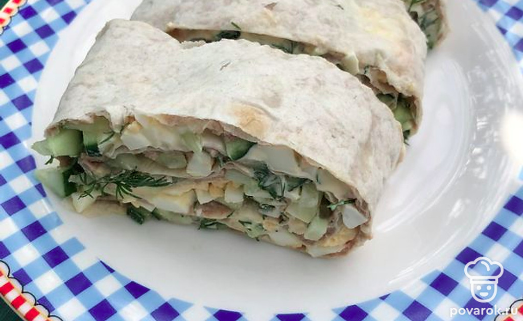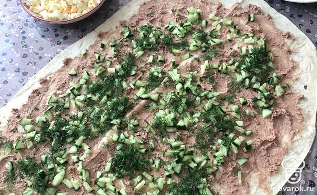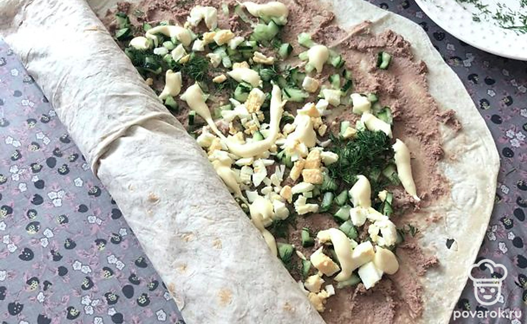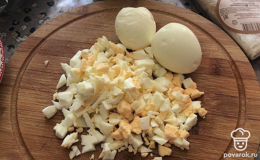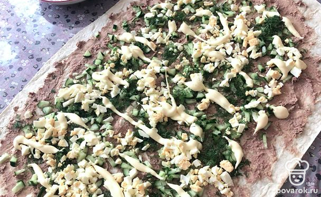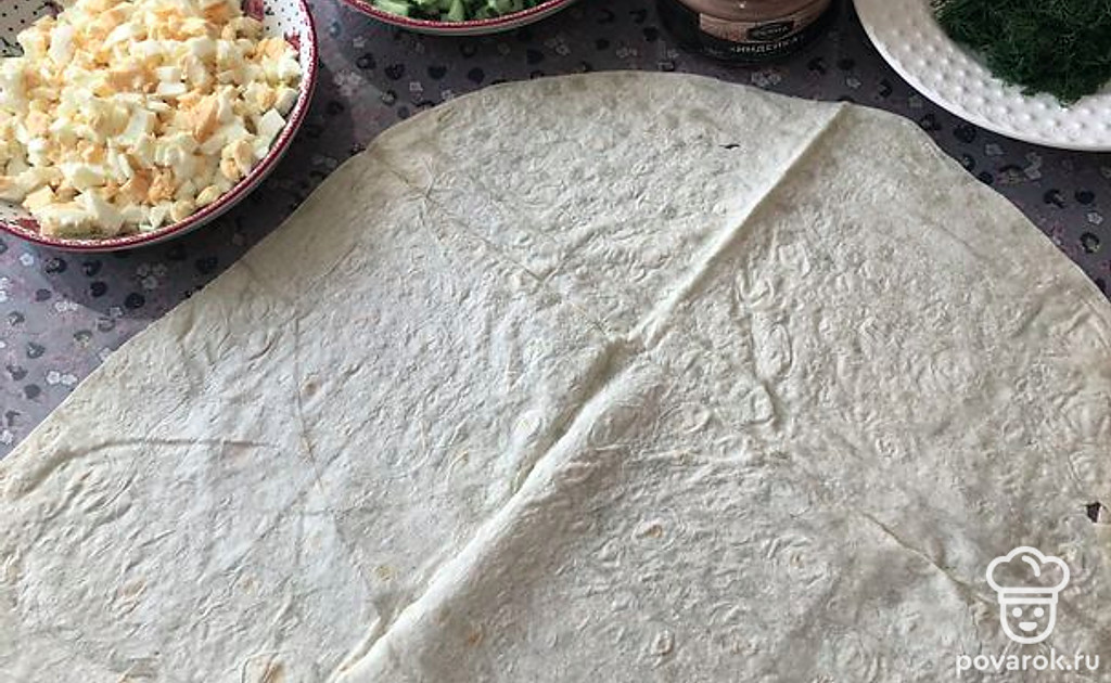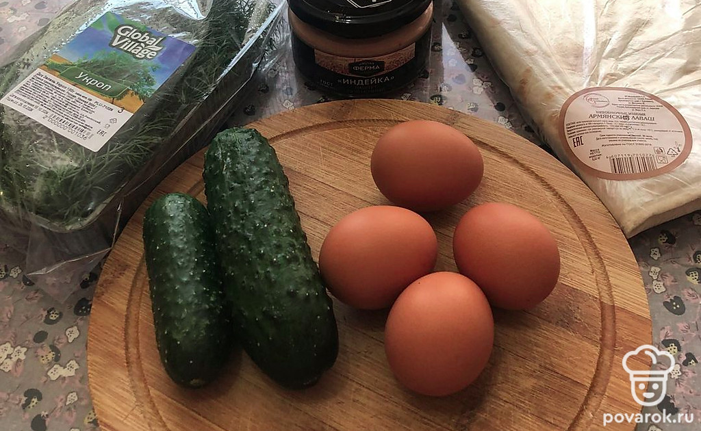 Подготовьте все ингредиенты. Яйца предварительно отварите и остудите. Огурцы вымойте и просушите. Лаваша нам понадобится 1 большой пласт. Майонез — по желанию.