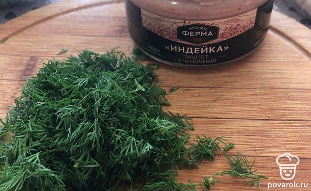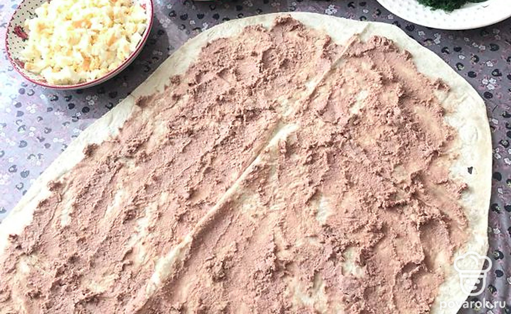 Смажьте его весь паштетом. Уходит ровно баночка паштета в 200 грамм.