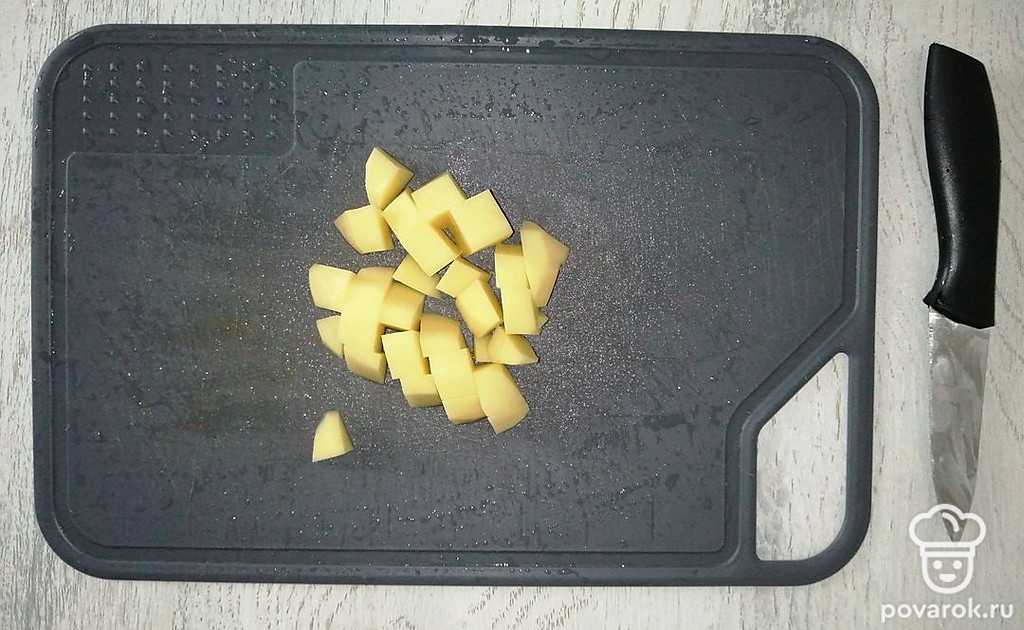 Далее нарезать картошку кубиками и добавить в кастрюлю.