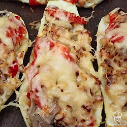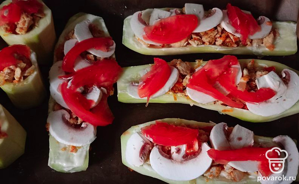 Очищенные половинки кабачка посолите, поперчите. Положите внутрь фарш, сверху разложите кусочки шампиньонов и помидора. Отправьте в духовку минут на 30 при температуре 170 градусов.