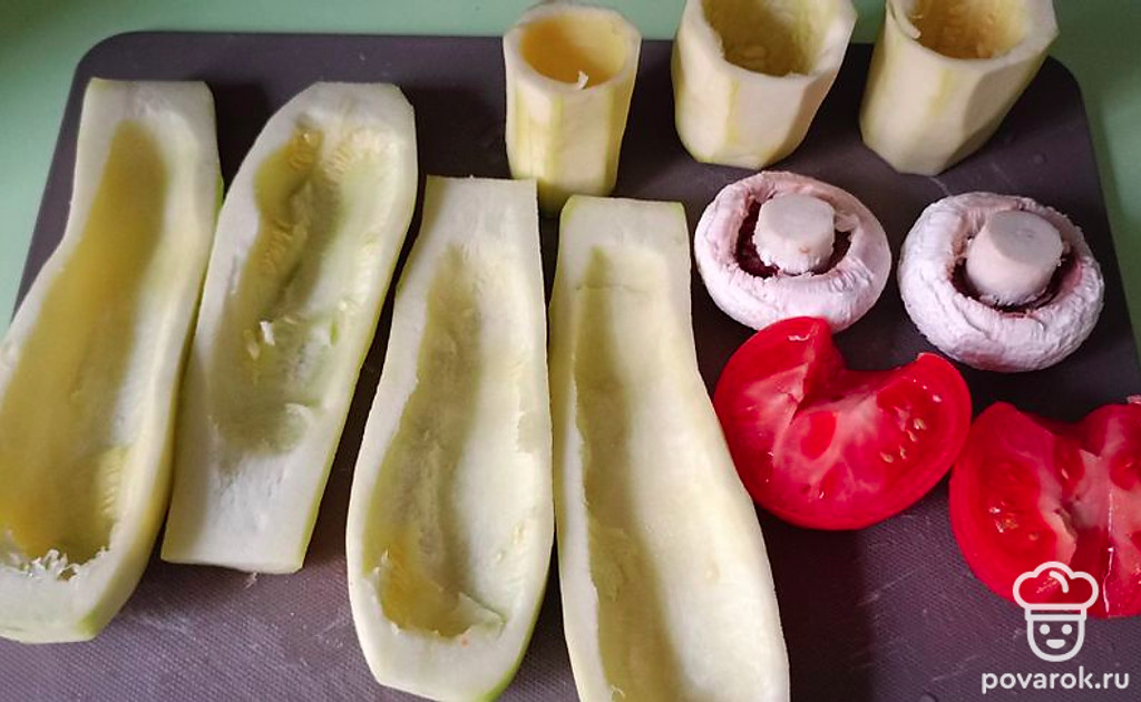 Из трех небольших молодых кабачков достаньте сердцевину. Очистите шампиньоны, помойте помидор.