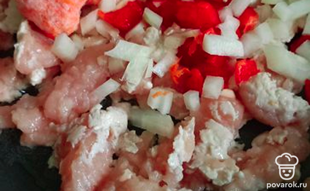На сковороде минут 5 обжарьте куриный фарш. Затем мелко нарежьте лук репчатый и красный перец. Натрите морковь. Все соедините и жарьте еще минут 5-7.