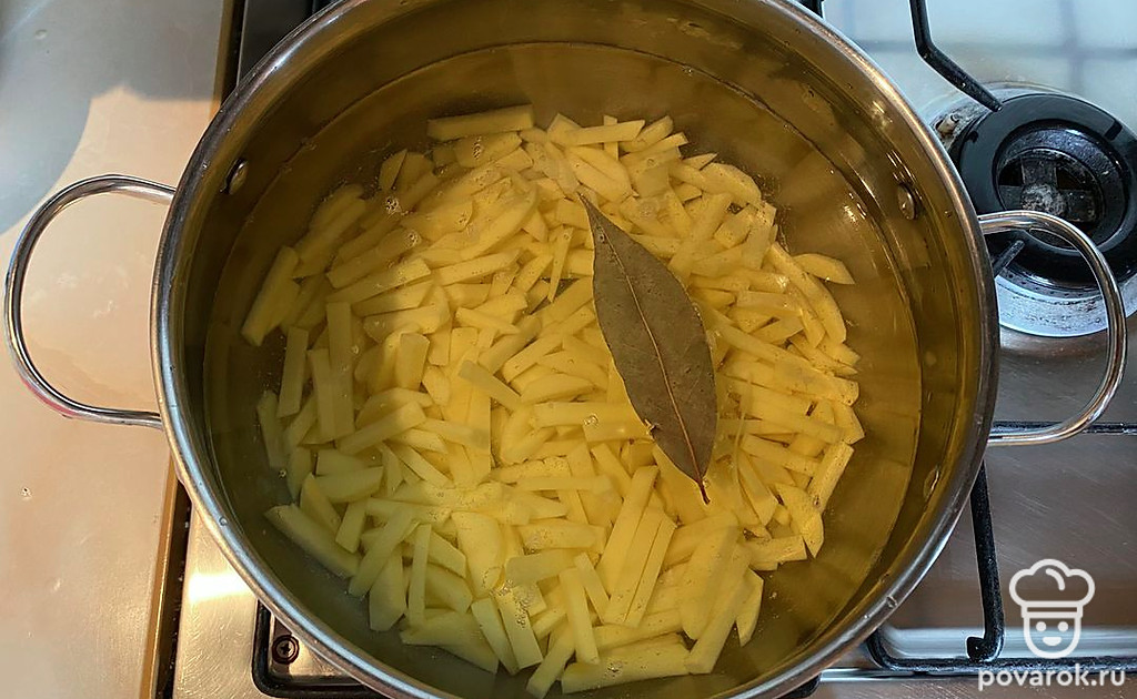 Нарежьте ломтиками картофель и отправьте его в подсоленную воду со специями.