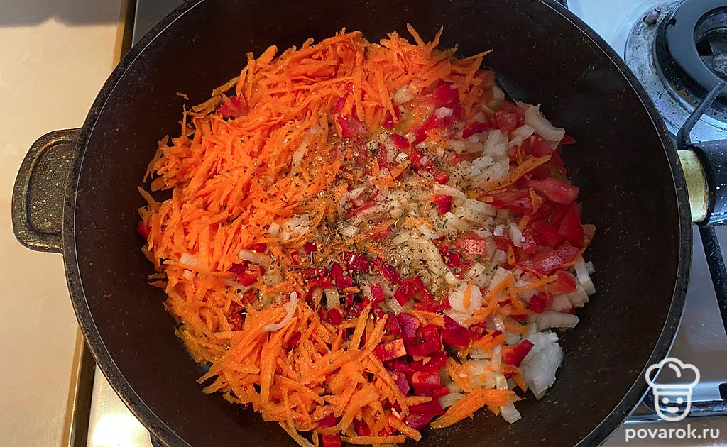 Обязательно на этом этапе добавьте специи. Как только картофель сварится, отправляйте пережарку в борщ.