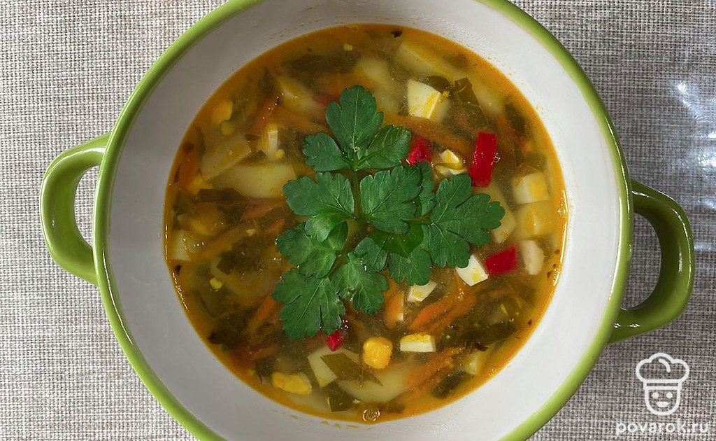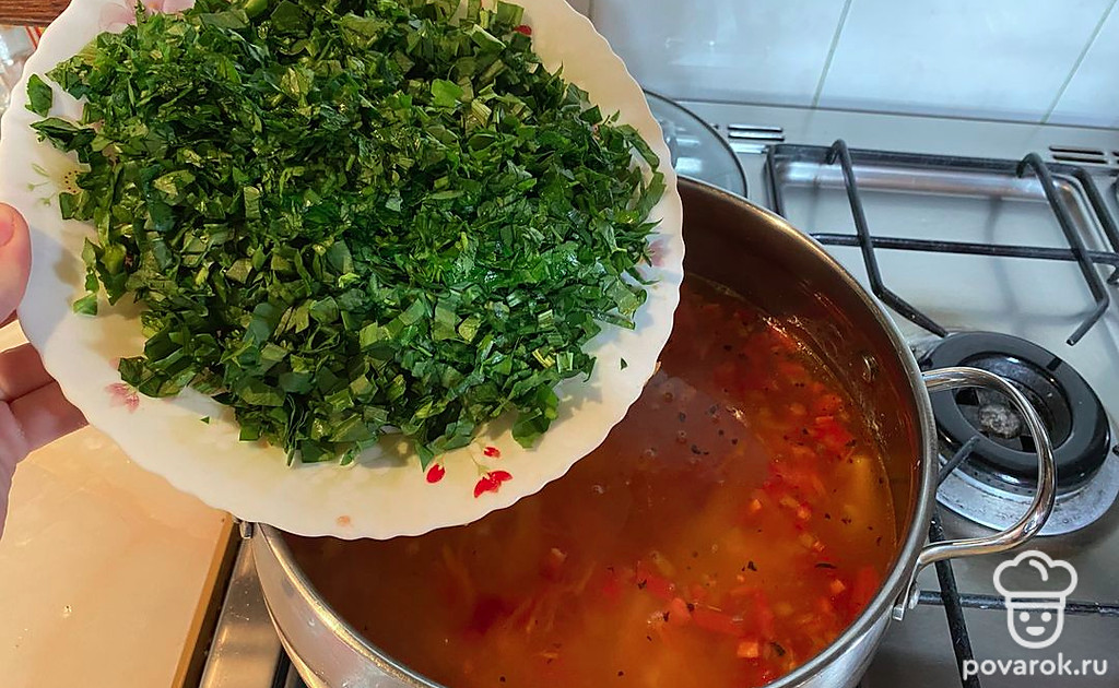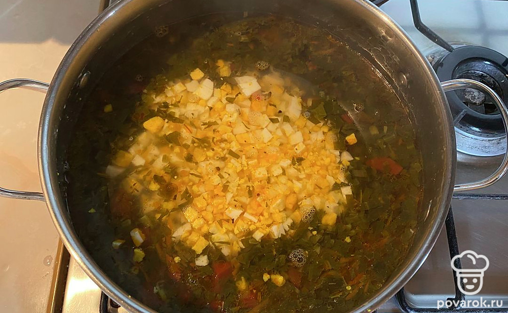 Нарежьте мелко щавель и добавьте его за пару минут до готовности.
