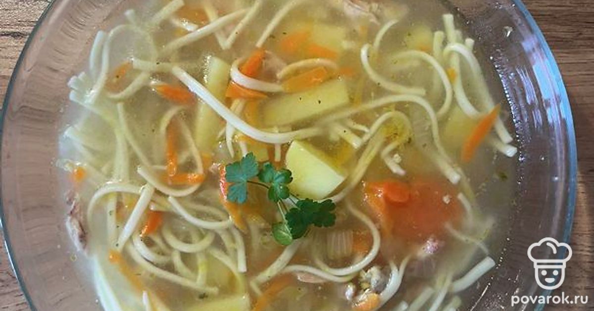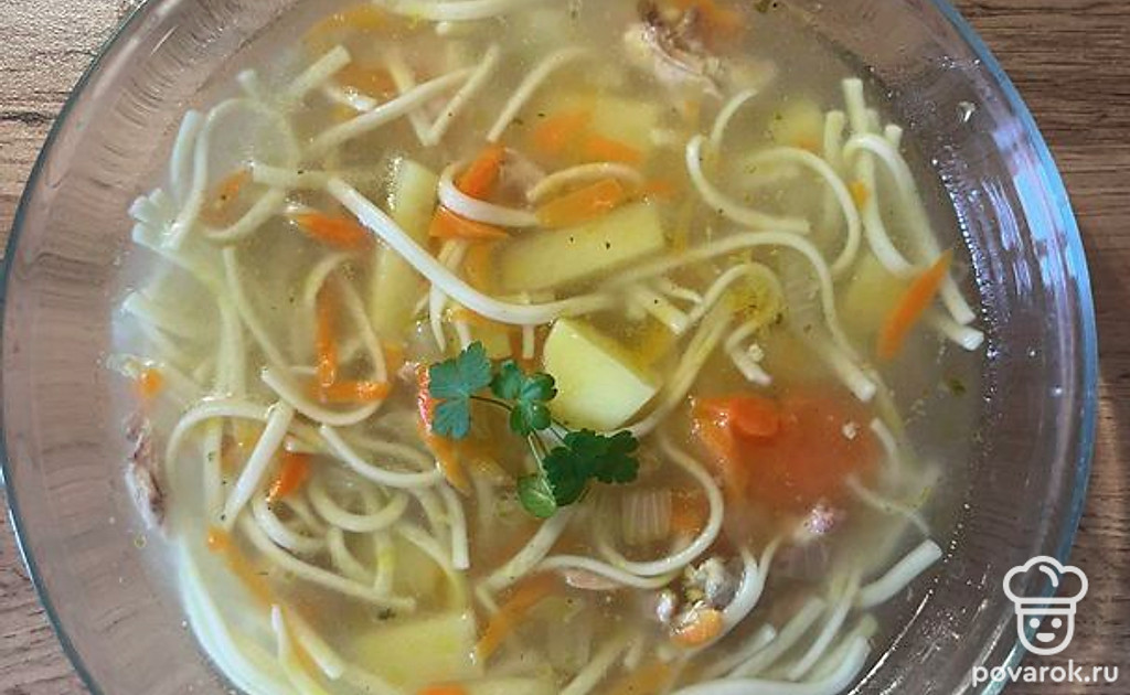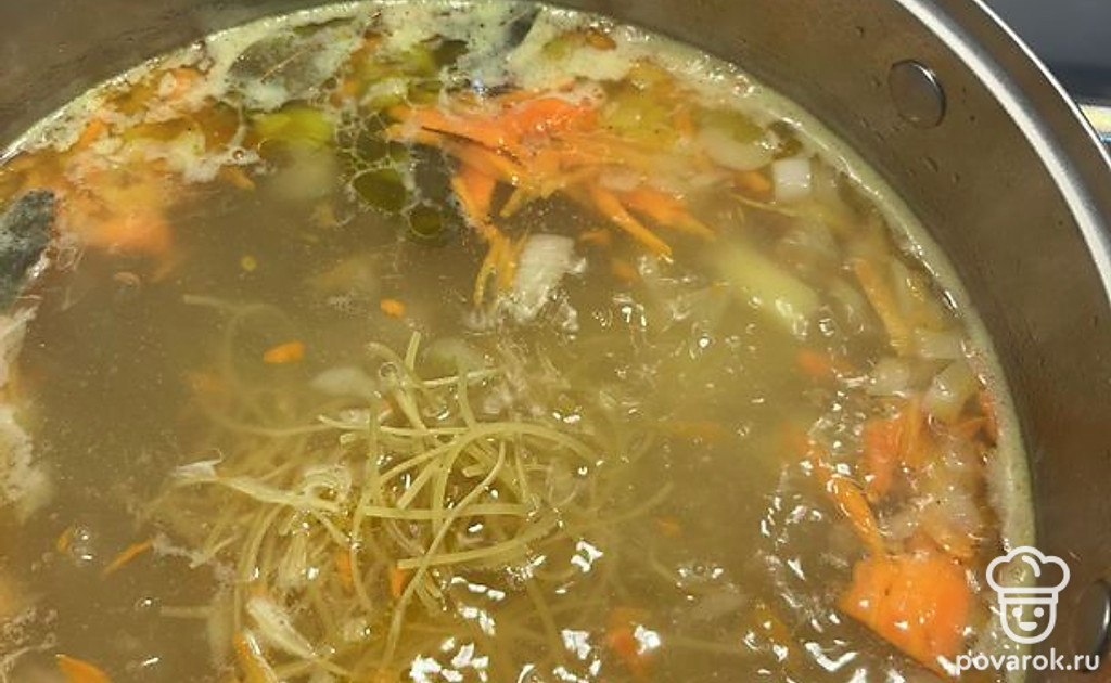 В кастрюлю переложить картофель, варить 20 минут. Далее добавить лапшу и зажарку из моркови и лука, варить 10 минут. Специи и соль по вкусу.