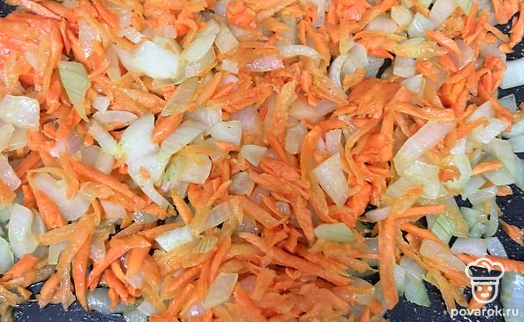 Лук обжарить до золотистой корочки, добавить натертую морковь и жарить 5 минут. Добавить специи по вкусу.