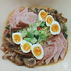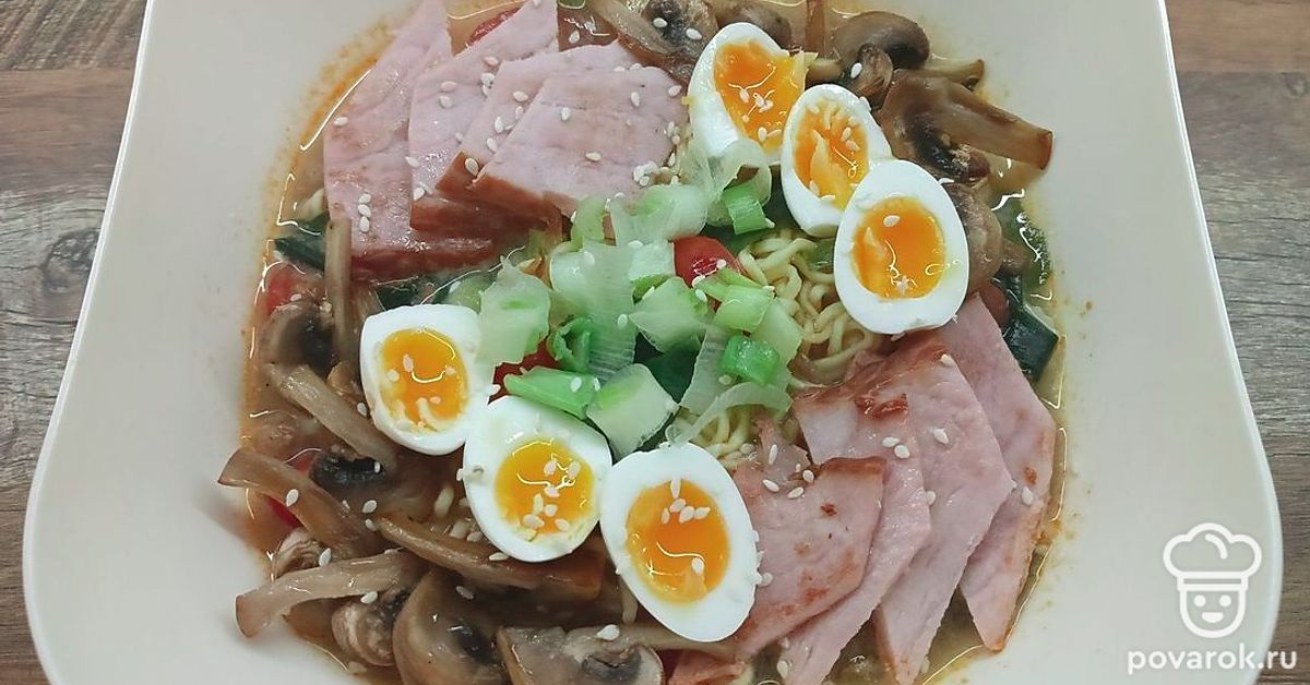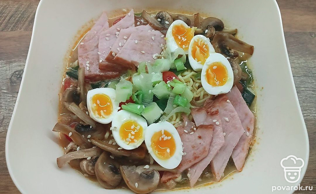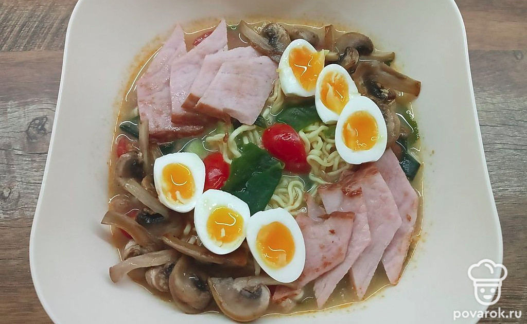 После того, как лапша разварилась, переложите ее в глубокую тарелку и тщательно перемешайте. Выложите сверху обжаренные грибы и мясо, нарезанные напополам яйца.