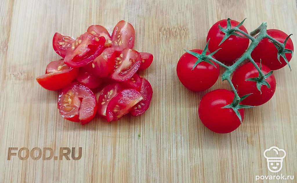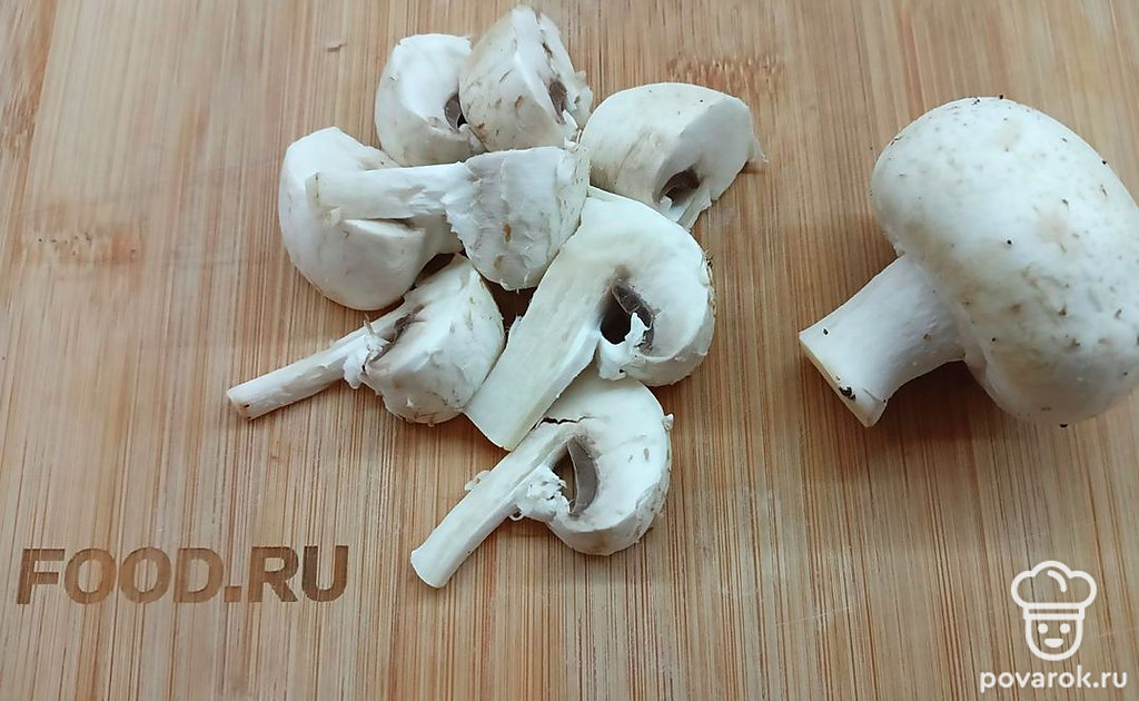 Нарежьте шампиньоны на 8 частей. Если у вас маленькие, то возьмите 4 штуки и нарежьте на четвертинки.