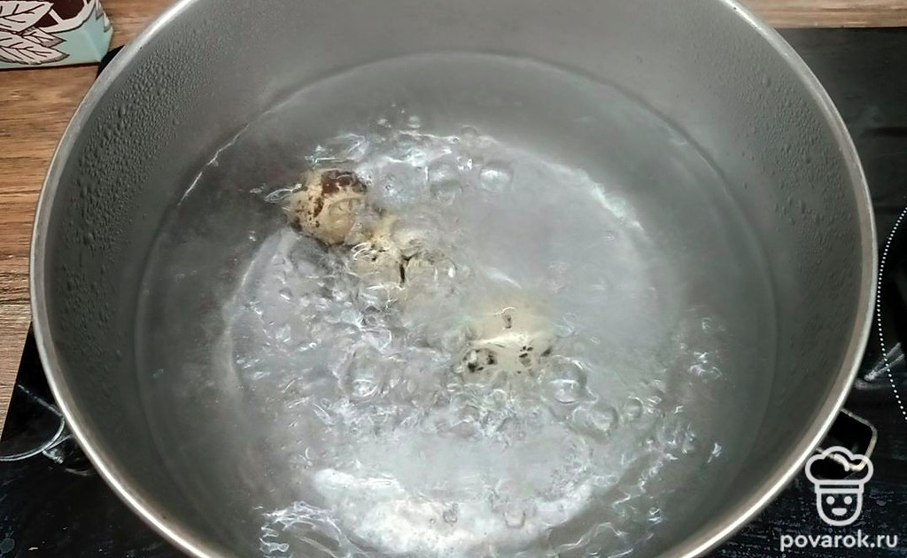 Перепелиные яйца отпустите в кипящую воду и варите 2 минуты. После чего сразу же переложите их в холодную воду до полного остывания. Так желток останется жидким.