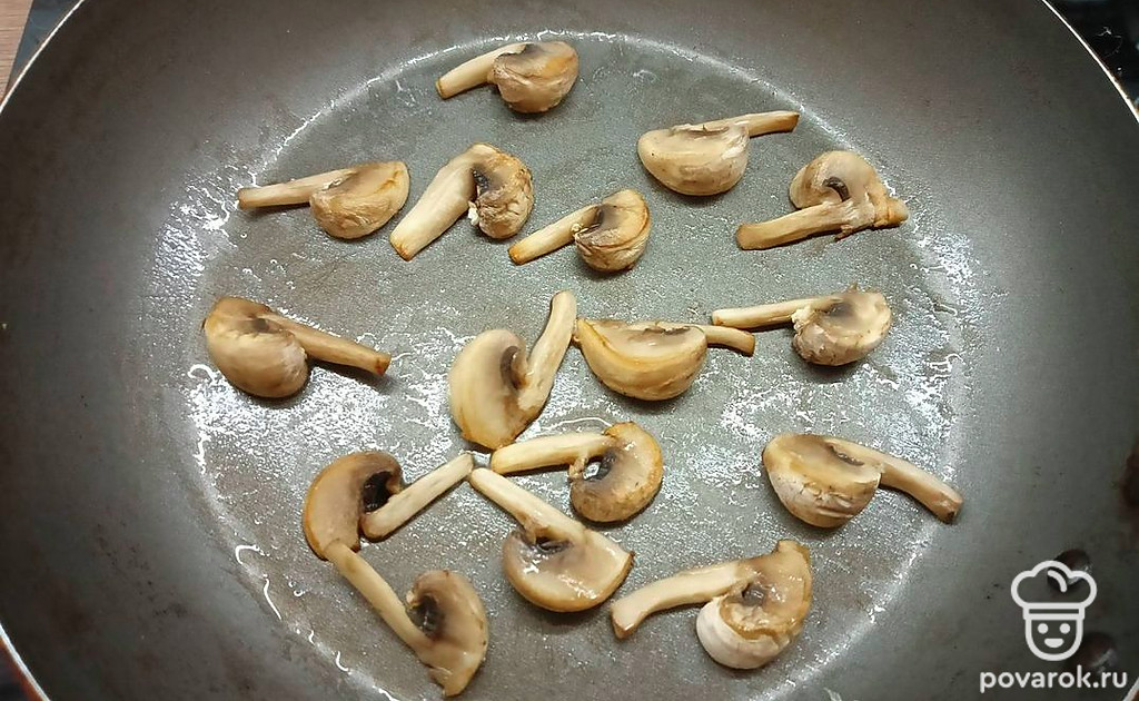 Шампиньоны обжарьте по 5 минут с каждой стороны на среднем огне на сковороде, смазанной растительным маслом, и отложите. Должна получиться золотистая корочка.