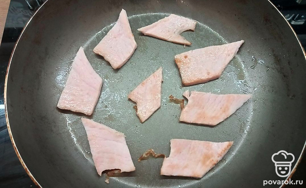Когда грибы будут готовы, на той же сковороде обжарьте с двух сторон ломтики мяса, так же до легкой золотистости, примерно по 3 минуты.
