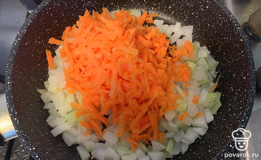 Лук нарежьте кубиком, морковь натрите на терке. Обжарьте на растительном масле.