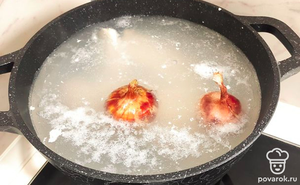 Отварите курицу с целой луковицей. У меня 2 маленькие. Добавьте в бульон нарезанный картофель.