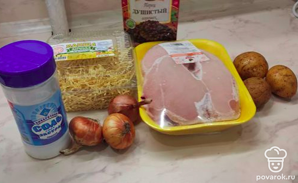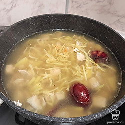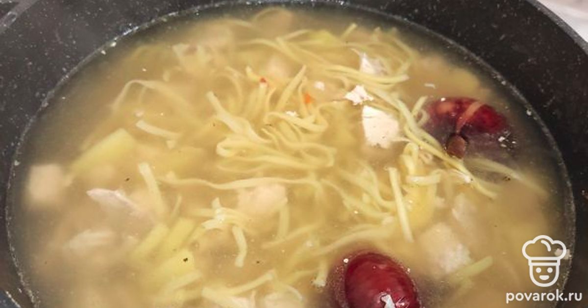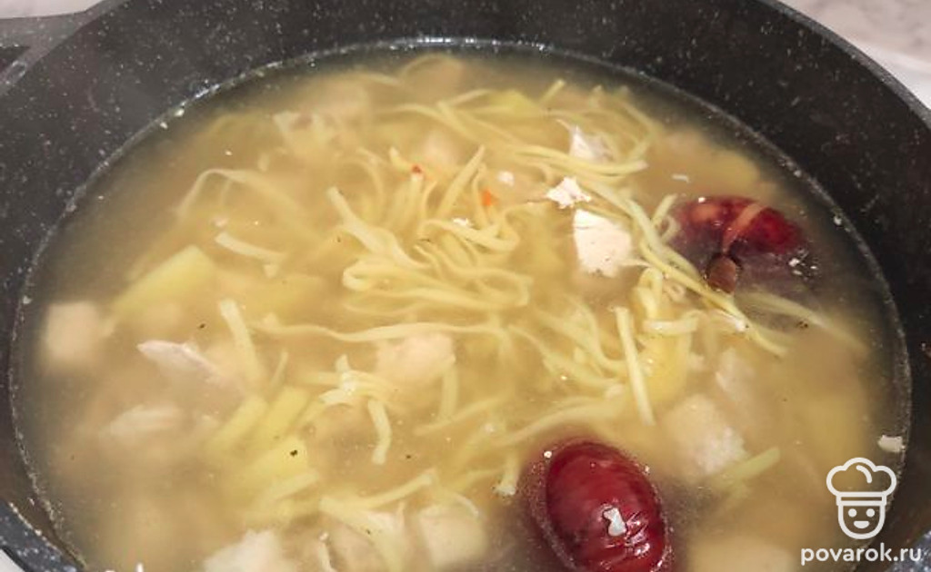 Добавьте лапшу, соль по вкусу. Снимите с огня.