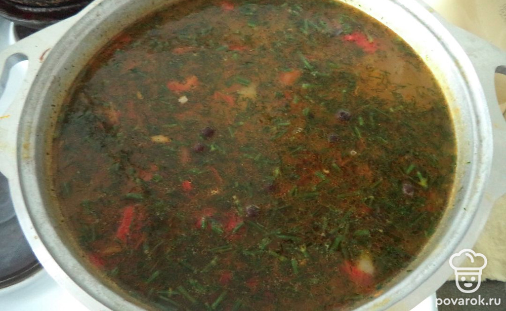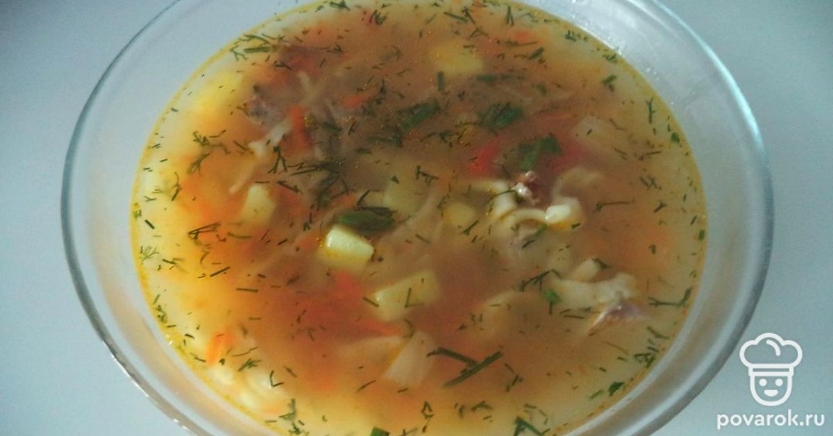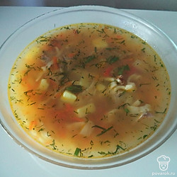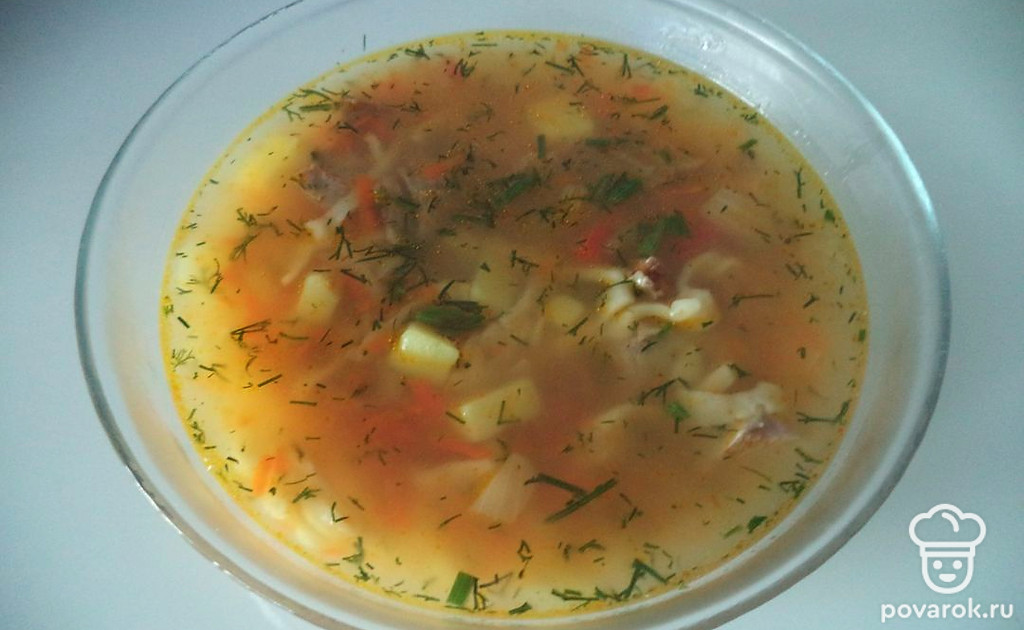 В бульон добавить поджарку, картофель и лапшу. По желанию добавить специи. Варить в течении 15 минут.