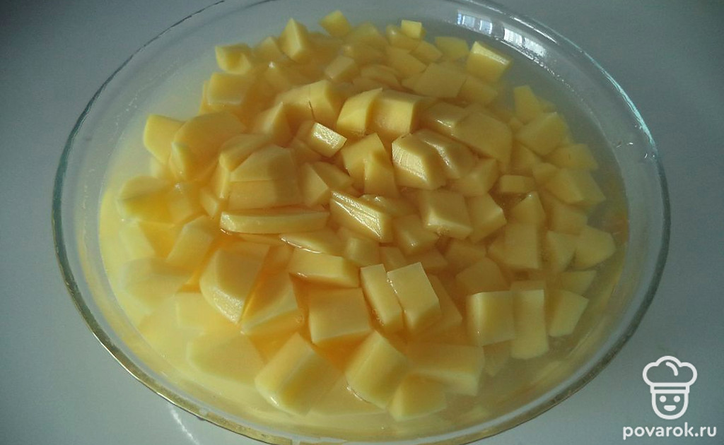 Сварить бульон из ноги индейки. Мясо порезать на небольшие кусочки.
