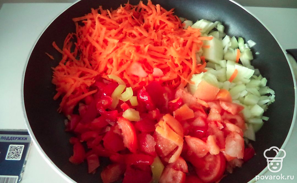 Нарезать лук, перец, морковь и помидор. Обжарить на масле в течении 15 минут.