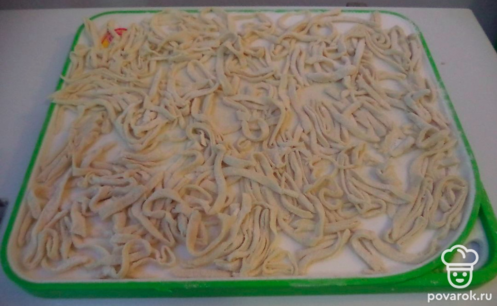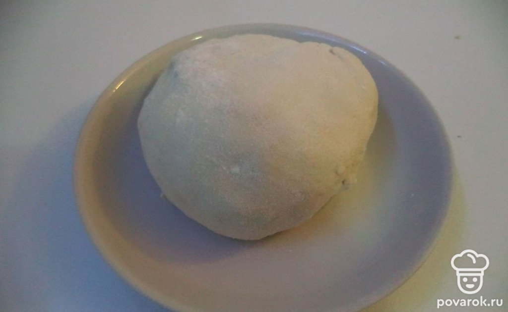 В муку вбить яйцо, 2 столовые ложки воды и замесить тесто.