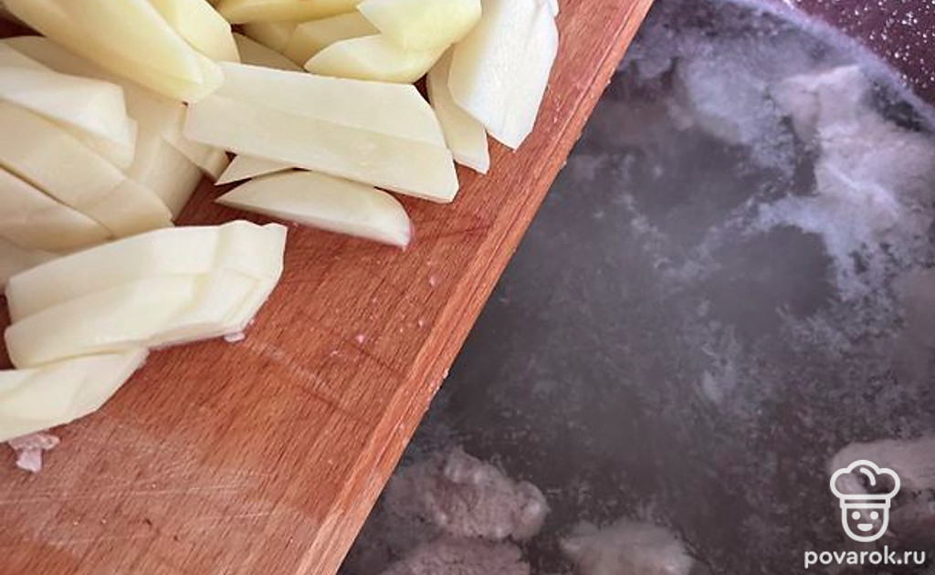 Как свинина сварилась, добавляем картошку.