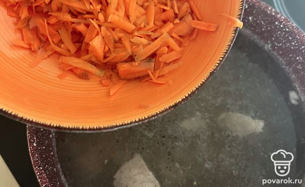 Когда картошку закинули, выкладываем мелко натертую морковку.