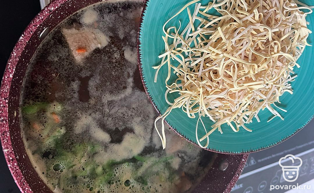 В самом конце забрасываем яичную лапшу.