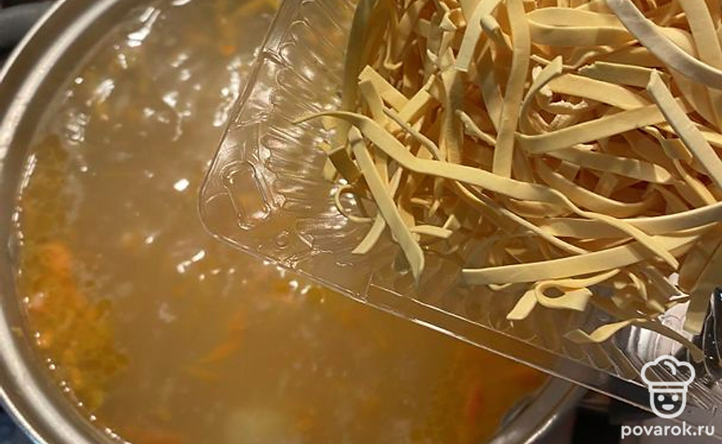 Отправляем в кастрюлю лапшу, солим и перчим.