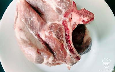 Кусок свинины на кости, примерно 700 граммов, помещаем в кастрюлю 4 литра. Варим мясо 30 минут. Воду перед этим солим.