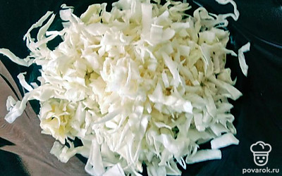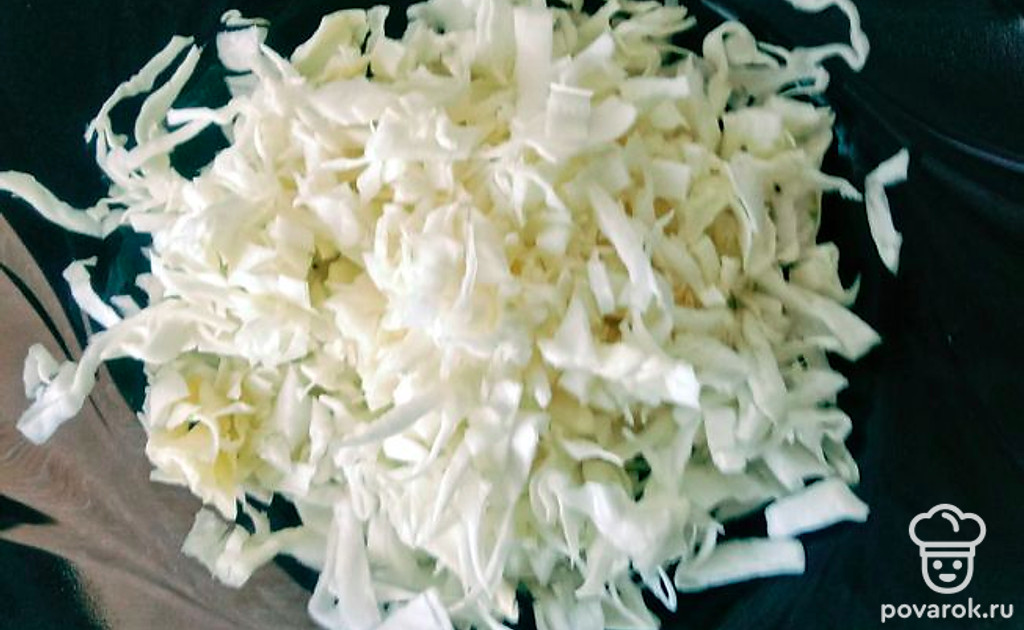 Шинкуем капусту и отправляем в кастрюлю с мясом.