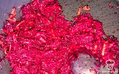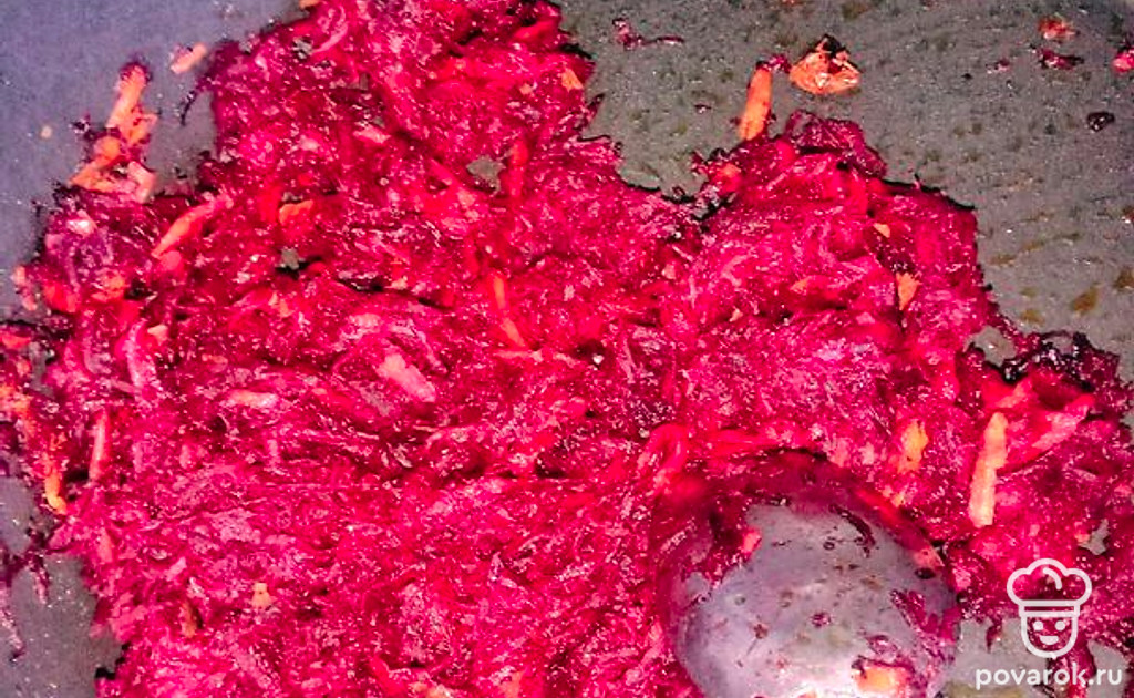 Пока варится мясо и капуста, готовим зажарку: на растительном масле жарим мелко нарезанный лук и тертые свеклу и морковь. Сюда же добавляем измельченный свежий помидор.