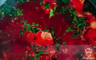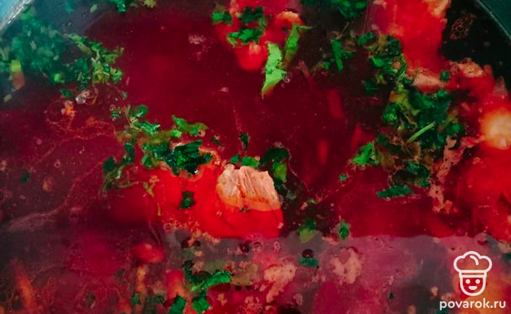 Еще через 20-30 минут добавляем в кастрюлю очищенный картофель и варим еще минут 15-20. Зажарку добавляем за 3-5 минут до готовности супа. Затем засыпаем зелень и закрываем крышкой. Даем настояться борщу минут 20.