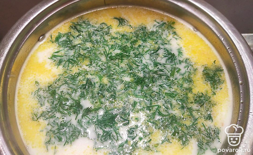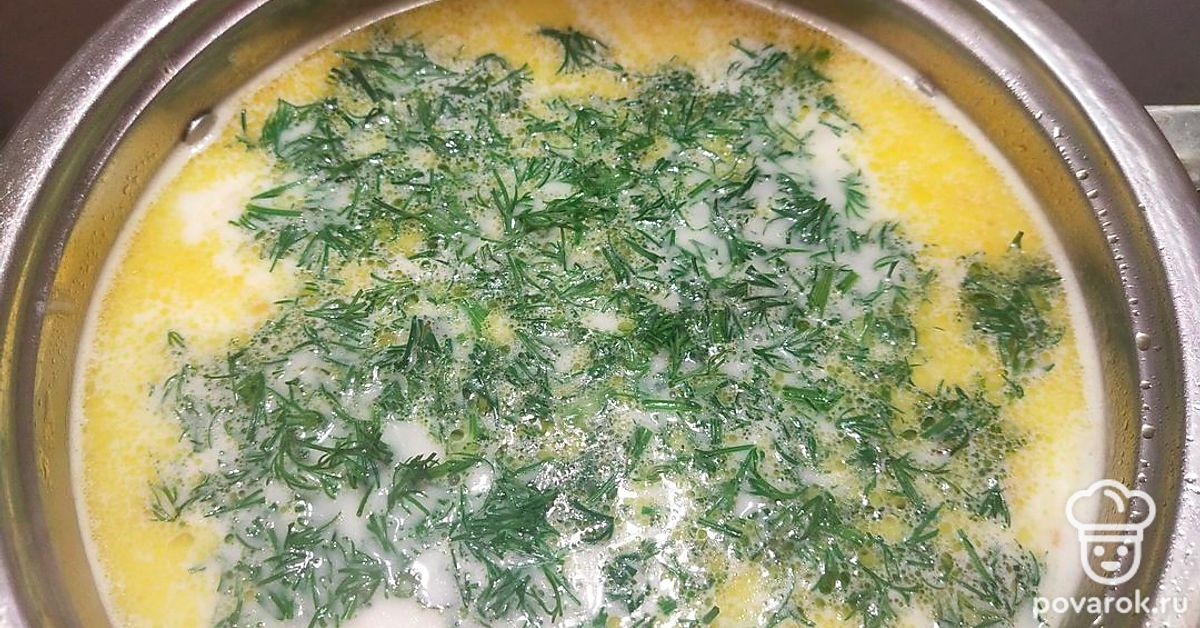 Добавляем плавленый сыр, доводим до кипения, по желанию добавляем зелень.