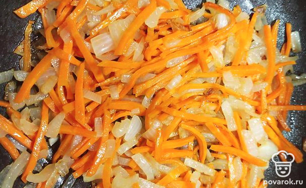 Лук, морковь нарезаем, обжариваем в масле 10 минут.