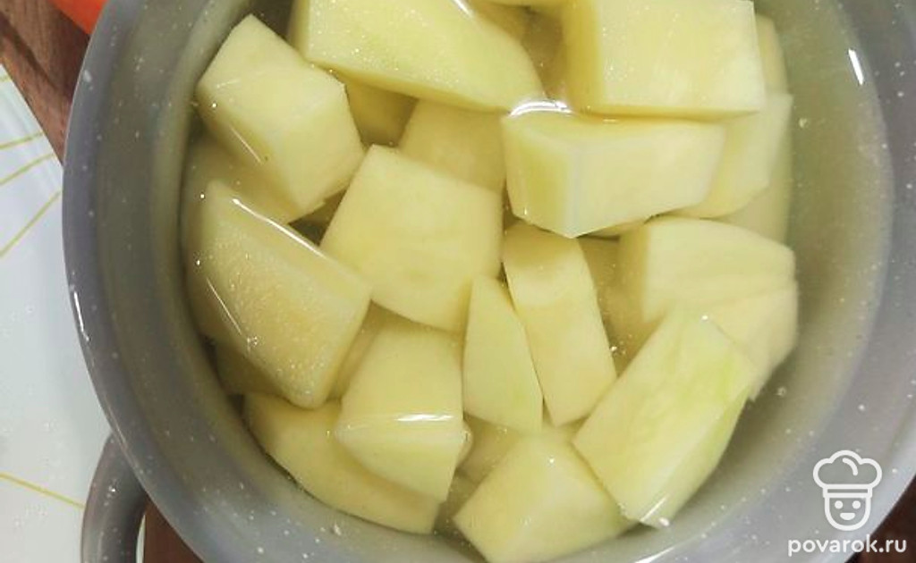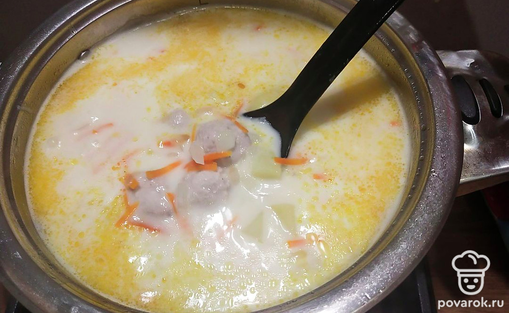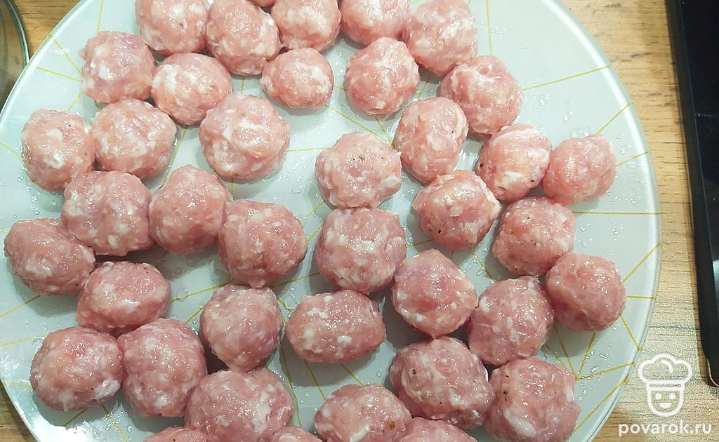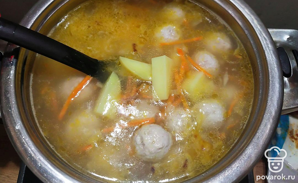В костлюлю наливаем воду или бульон, добавляем зажарку, картофель, когда закипит, добавляем фрикадельки, варим 40 минут.
