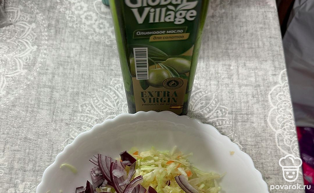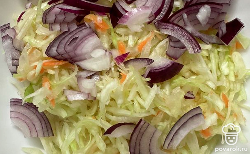 Капусту и морковь нашинкуйте, посолите и перетрите.